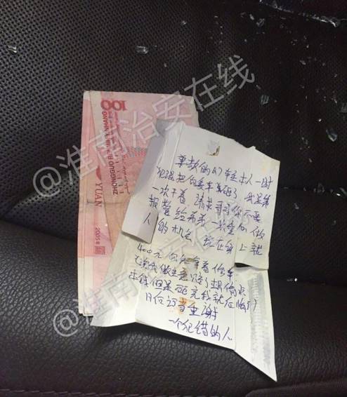 ◆17日,安徽一车主发现自家车窗被砸,车里“多出”四百元钱和一张道歉条。原来是作案者做生意失败后起了盗窃的邪念,在砸车窗后却后悔了,于是留下钱和道歉信请求原谅。大家觉得,应不应该原谅他呢?