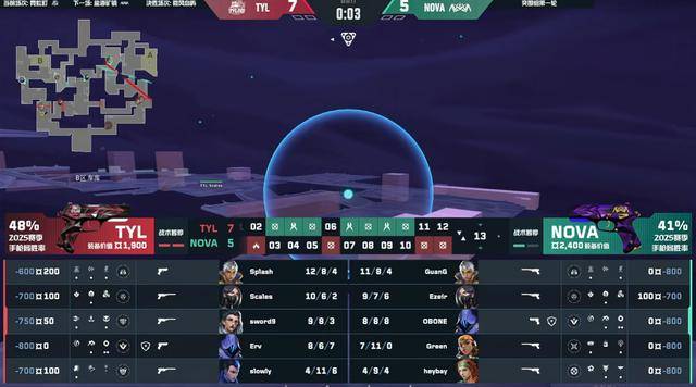 上半场天禄赢下手枪分,第3回合GuanG在包点连接三个,打掉了天禄的进攻节奏。NOVA开局就奖励局拿到一分,他们在防守端拿不到信息,只能被动的在包点里接人,NOVA处于一个劣势的循环阶段。第6回合NOVA调整站位,并给GuanG起到冥驹,但是天禄这回合选择打A夹击,Scales蝰蛇开大覆盖包点,Splash在毒雾里短炮+刀化身武器大师,让NOVA的回防全部破灭。第8回合NOVA两个大招,让天禄无法打B,转点又被换人。第10回合NOVA想要抢B前点,Splash霓虹直接滑铲躲了众多技能,并打掉NOVA。第12回合NOVA回防A点出现沟通失误,一个一个干拉,被Erv连接四个赢下。上半场天禄拿到了10分,而NOVA只拿到2分。