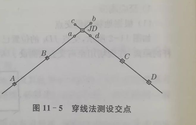 用同样方法测设另一中线所示。AB、CD直线在地面上测设好以后,即可测设交点。将经纬仪安置于B点,瞄准A点,倒转望远镜,在视线方向上、接近交点JD的概略位置前后打下两桩(称为骑马桩)。采用正倒镜分中法在这两桩上定出a、b 两点,并钉以小钉,拉上细线。将经纬仪搬至C点,后视D点,同法定出c、d点,拉上细线。在两条细线相交处打下木桩,并钉以小钉,得到交点JD。