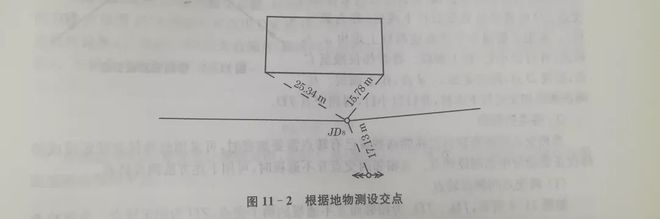 如图11-2所示,交点JD2的位置已在地形图上选定,在图上量得该点至房屋两角和电杆的距离,在现场用距离交会法测设JD。