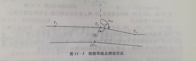 导线点的坐标和交点的设计坐标,计算测设数据,用极坐标法,距离交会法或角度交设交点。如图11-3所示,根据导线三点的坐标,计算出导线的平距D和方位角a,用极坐标法测设JD11。