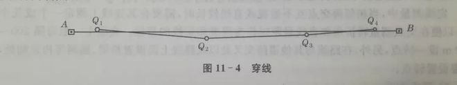 在图上选定中线、Q、Q,根据邻近地物或导线点量得测设数据,用合适的方法在实地测设这些点。由于图解数据和测设工作中均存在偶然误差,使测设的这些点不严格地在一条直线上。用目估法或经纬仪视准法,定出一条直线,使尽可能靠近这些测设点,这一工作称为穿线。穿线的结果得到中线直线段上的A、B点(称为转点)。